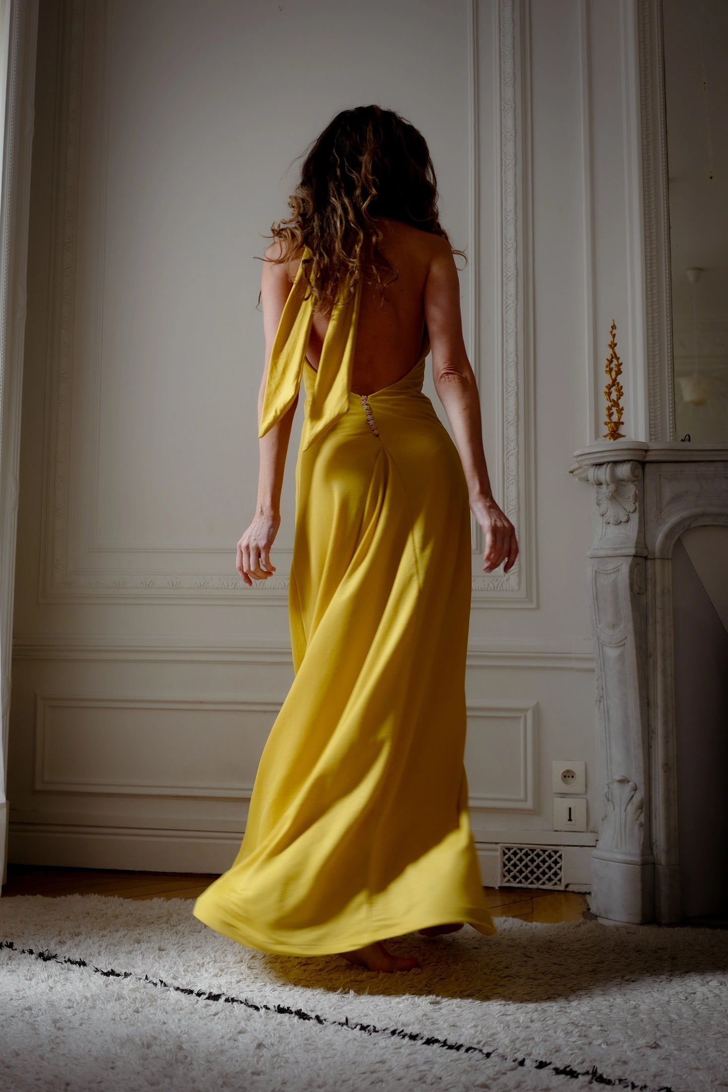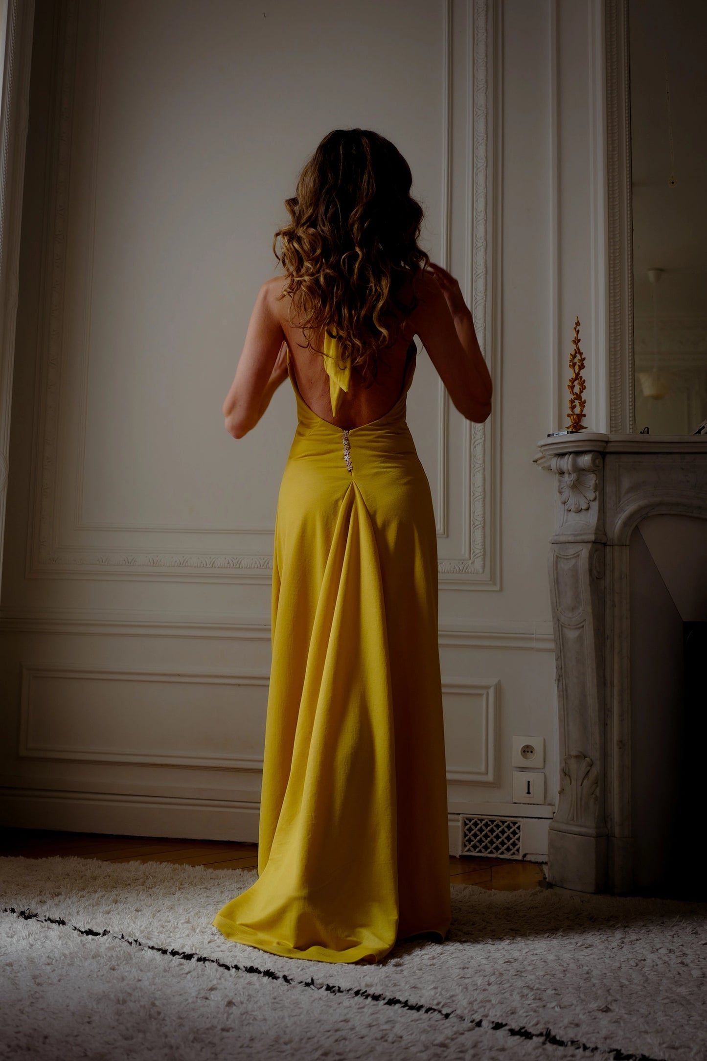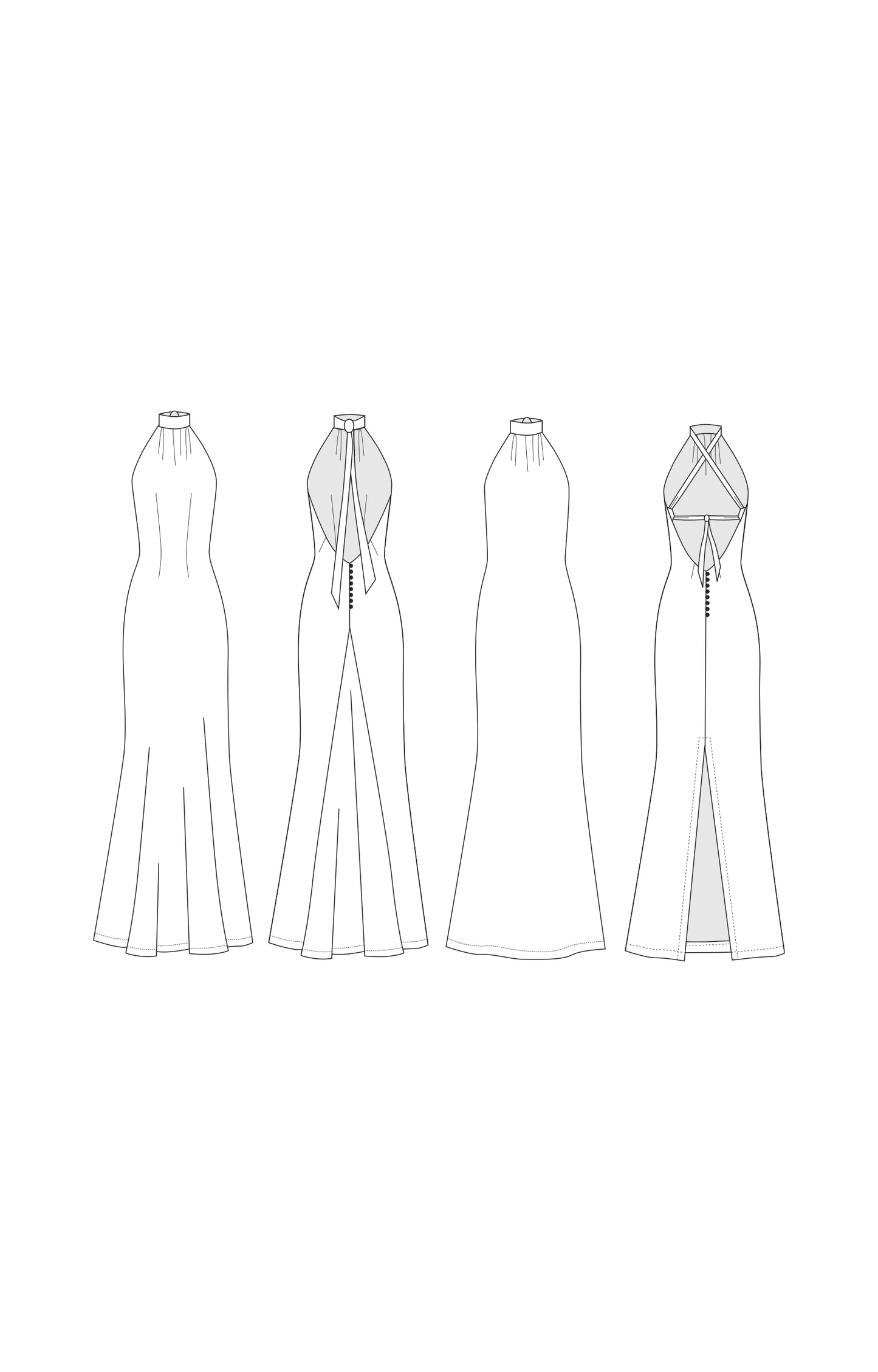 L'alliance d'un dos-nu vertigineux et d'une multitude de détails pour une robe mémorable. Ce patron contient différentes options, de la robe longue de plage fluide à la robe plus ajustée avec quille au dos à l'allure sublime. Cette robe gardera un esprit flou, confortable et audacieux.