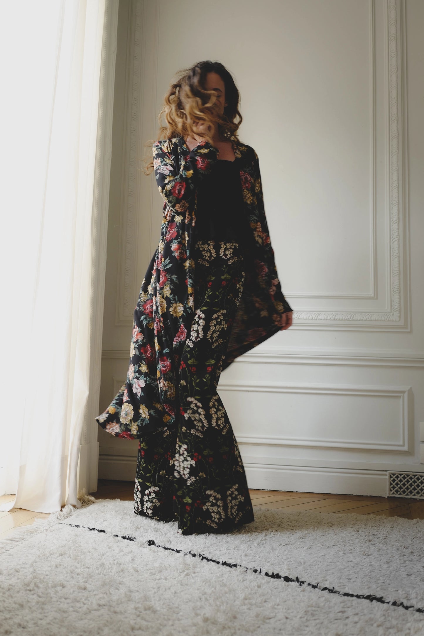 Modèle CRÈME en laine et cachemire présenté avec la jupe BOHÈME et le pantalon MY WAY. Modèle vert pomme présenté avec la jupe MIDI et un pull MAJUSCULE. Modèle viscose et voile fleuri, pour une version soirée présenté avec la gamme BOHÈME